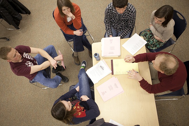 Ashlee Buller, Levi Proctor, Decon Zander, Andy Walling and Jaclyn Rensel, clockwise from bottom, listen to suggestions from Josh Munroe during practice for partner debates Tuesday afternoon at Glacier High School while practicing for the state speech and debate tournament.