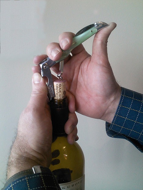The opener that seems to challenge most folks is the traditional waiter's corkscrew, which is the one with a fold out knife on one end for cutting the foil, the "worm" that folds out from the middle of the device and a fold out lever on the opposite end of the opener from the knife that rests on the neck of the bottle to provide leverage when pulling the cork. There are many styles of this traditional instrument. I prefer the one with a straight handle as it works better for me but the technique is the same for the ones with a slightly curved handle. Some of these are now made with a Teflon coated "worm" which screws into the cork more easily.