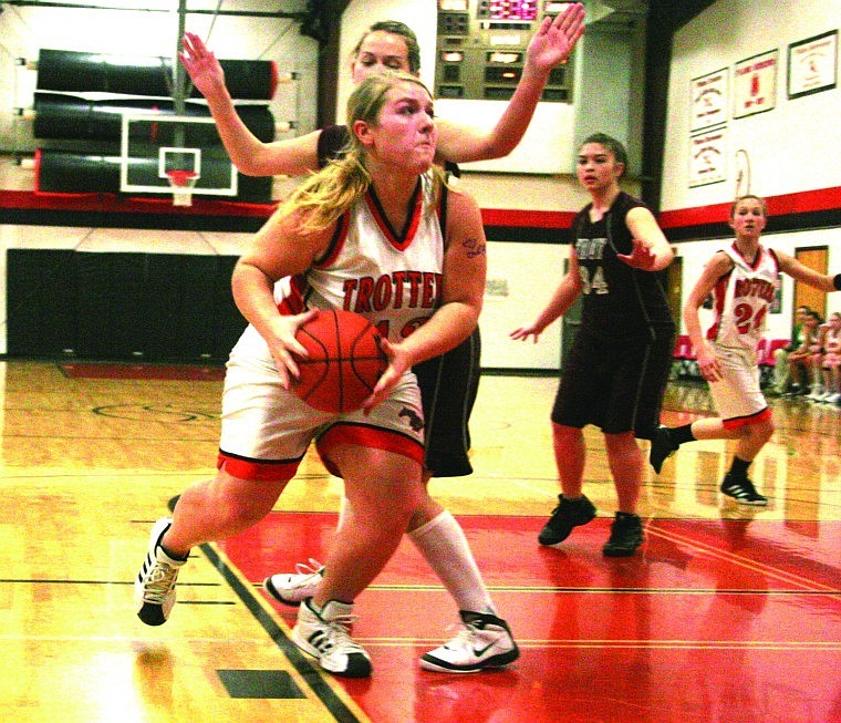 JV Trotters sophomore Tia Thompson goes up for a post-shot Friday night against the Troy Lady Trojans. The JV Trotters won 26-18.