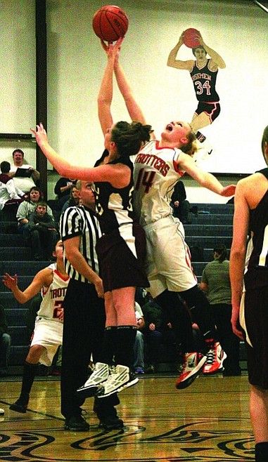 Trotters freshman Kayla Holmes goes up for the game tip-off Friday night against Troy Lady Trojans. The Trotters won 43-24.