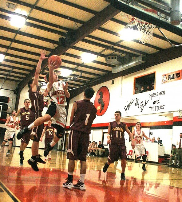 Horsemen sophomore Keith Woodward goes up in the paint for a score Friday night against Troy Trojans.