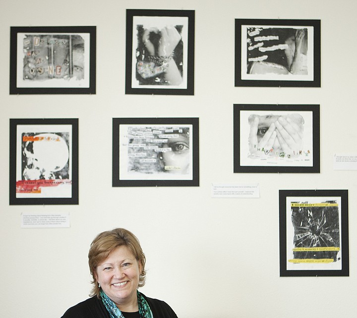 Diane Dwyer, victim impact program coordinator for the Center for Restorative Youth Justice, stands by a wall covered in art work from children she has worked with. The art was created as a reflection exercise where the child was given a "Victim Impact Statement" and told to create a collage based on the statement.