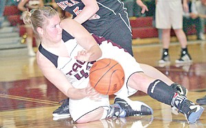 Playing hard despite the competition, junior forward Breanna Opland, above left, passes to Kelli Lundin in the first quarter against Eureka.