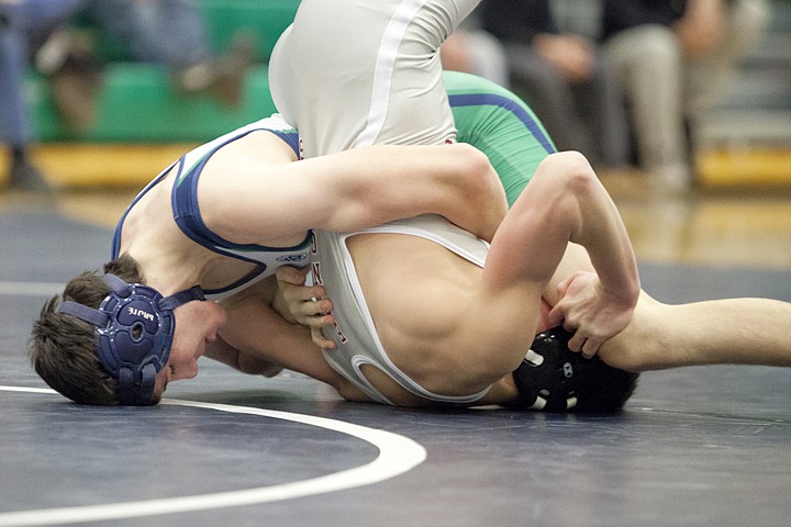 Glacier’s 130-pound wrestler Kaleb Mitchell (top) tries to pin Cooper Ryan during the Wolfpack’s victory over Helena High Saturday night at Glacier High School.