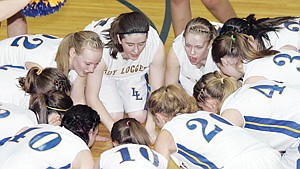 Lady Loggers' pre game huddle before the tip against the Columbia Falls Wildkats.