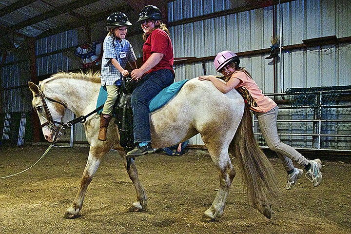 <p>JEROME A. POLLOS/Press Daelynn McInelly, 10, slides off the back of a horse as her vault riding classmates Brynna Smith, 8, left, and Rachael Fetter, 15, wait for their instructions to dismount Wednesday during a class at the 4-H Equine Retreat at the Kootenai County Fairgrounds. The retreat began Monday and offers participants of the 4-H equine program the opportunity to learn Western and English riding styles, vaulting, and mounted shooting. A cowboy breakfast fundraiser is scheduled for Saturday at 7:30 in the red barn at the Kootenai County Fairgrounds followed by a demonstration…