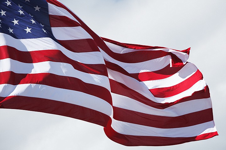 An American flag waves in the wind Tuesday afternoon above the Perkins parking lot on U.S. 2 in Evergreen.