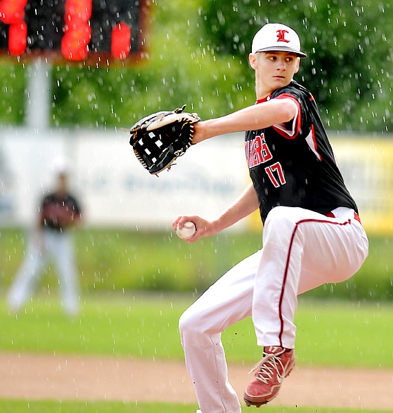Dillon Eaves, 17, of the Kalispell Lakers continues to pitch in spite of a light rain on Tuesday afternoon in the game against the Great Falls Chargers.
