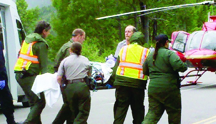 Glacier Park workers carry an injured trail worker to the ALERT helicopter Tuesday afternoon on Going-to-the-Sun Road.