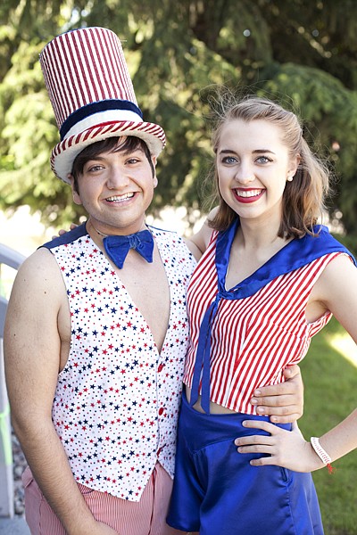 Bigfork Summer Playhouse actors David Brumfield from Prairieville, La., (left) and Mollie Craven from Austin, Tx. are dressed in costume for the Bigfork 4th of July parade. Every year the playhouse enters a float in the parade, and hands out costumes to the actors to wear.