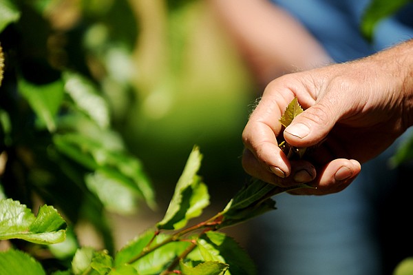 Detail of a grower examining the leaves of a cherry tree at the Sweet Cherry Variety Trials on Flathead Lake on Thursday, June 28, in Yellow Bay.