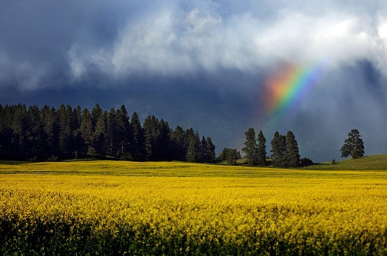 A hint of rainbow lights up the sky north of Kalispell while a canola field glows in the foreground.