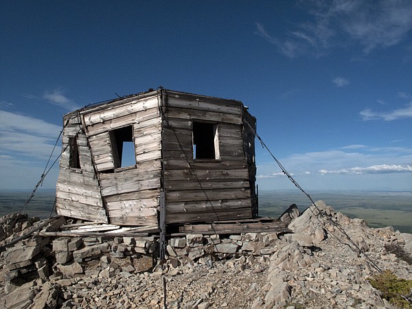 In Glacier National Park an old abandoned lookout tower sits on the ridge of Divide Mountain, 8,665 feet, is located at on the border of the park just south of St. Mary Lake.