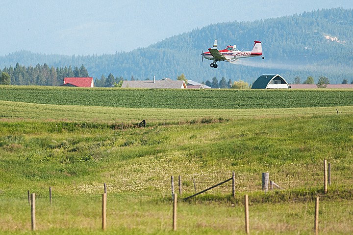 Crop-dusting expert Mike Campbell of Dutton pilots a Cessna A188B spraying a wheat field off West Valley Drive Friday morning. The spray is targeting the orange wheat blossom midge, an annual threat to wheat in the Flathead Valley. The spray was initiated after the CHS Agronomy Team discovered the midge in its larval stage. Spraying will continue Monday and is not harmful to humans or animals.