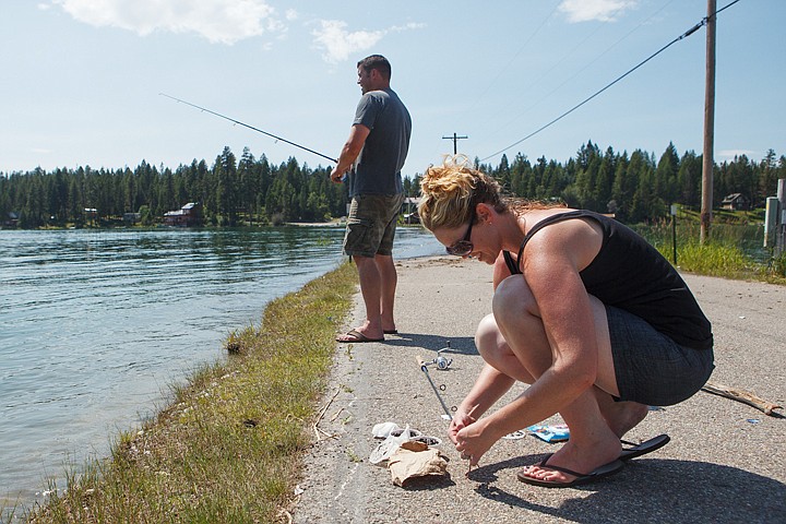 Laura Davis baits a hook while her husband Charles fishes off the edge of the Echo Lake Causeway Friday afternoon at Echo Lake. The causeway is closed to vehicle traffic due to high waters. Friday, July 6, 2012 in Echo Lake, Montana.