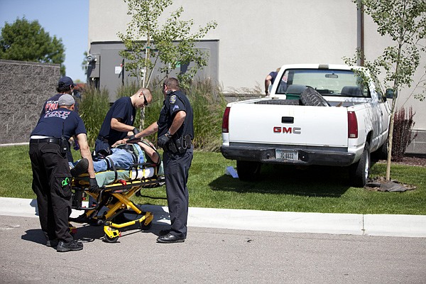 The Kalispell Fire Department and Evergreen Fire Rescue provide medical attention for the driver of a truck that crashed into gas line on the side of Little Caesars Pizza on North Meridian Avenue in Kalispell on July 6. Kalispell Police Department patrol sergeant Mark Mulcahy said the gas was turned off and the driver was incoherent when emergency crews arrived on scene.