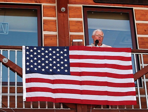 John Pearson sings the national anthem on the balcony of Grille 459 in Bigfork Friday. The anthem will be sung Friday through Sunday at 10:15 a.m. until the end of August.
