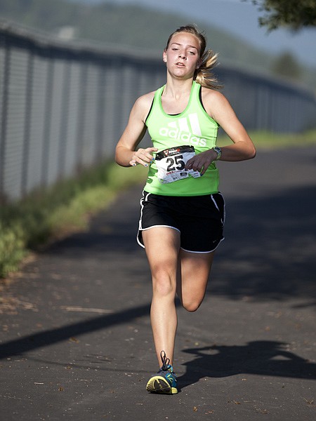 Nicole Brist, 17, from Whitefish finishes first for the women in the Literacy Volunteers of Flathead County 5K fun run and walk in Kalispell on Saturday morning, July 7.