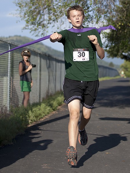 Carson Brown, 14, from Kalispell punches his way through the ribbon as he crosses the finish line first in the Literacy Volunteers of Flathead County 5K fun run and walk in Kalispell on Saturday morning, July 7.