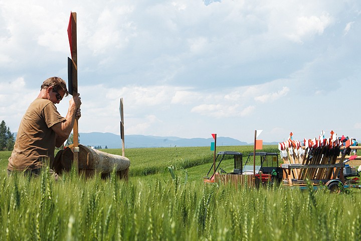 Bert Wood attaches a jump marker Tuesday afternoon in preparation for The Event at Rebecca Farm. Top-flight equestrian competition will be staged Thursday through Sunday at the venue northwest of Kalispell.