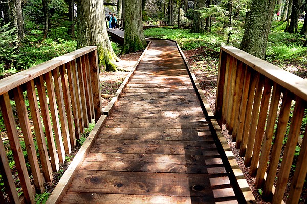 Tourists make their way along the Trail of the Cedars boardwalk in Glacier National Park. The Trail of the Cedars is part of the popular trail to Avalanche Lake.