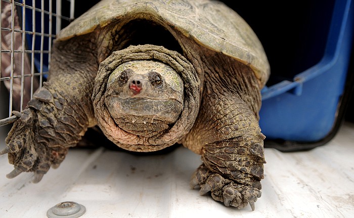 An aggressive 20-pound snapping turtle was captured by Paul Charbonneau of Flathead County Animal Control Friday morning in Kalispell. The turtle reportedly was first caught in the creek near Cemetery Road by a man who delivered it to his ex-girlfriend. Charbonneau took the turtle to Montana Fish, Wildlife and Parks, where he was told it would be killed since it’s not native to this part of Montana. According to Alan Wood, a state biologist, snapping turtles are very good at eating everything they can catch, up to and including ducks. They compete with native species for food. “We don’t want a species introduced where they haven’t been historically because it will alter the ecosystem,” Wood said.