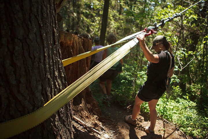 Trail guide Lisa Nichols ducks underneath one of the support cables for the Walk in the Treetops boardwalks Wednesday at Whitefish Mountain Resort. Wednesday, July 11, 2012 in Whitefish, Montana.