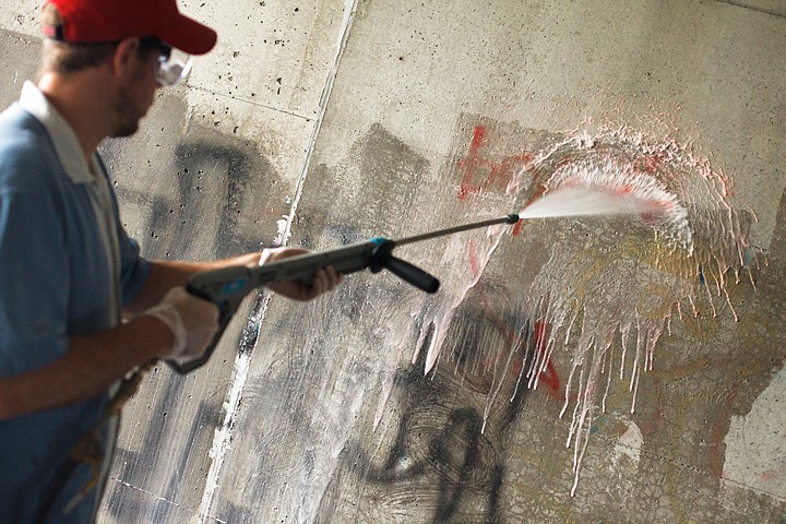 Patrick Cote/Daily Inter Lake Kalispell City Manager Doug Russell uses a pressure washer to clean graffiti off the walls of the tunnel under U.S. 93 near Flathead Valley Community College Saturday morning during a community graffiti cleanup day. Saturday, July 14, 2012 in Kalispell, Montana.