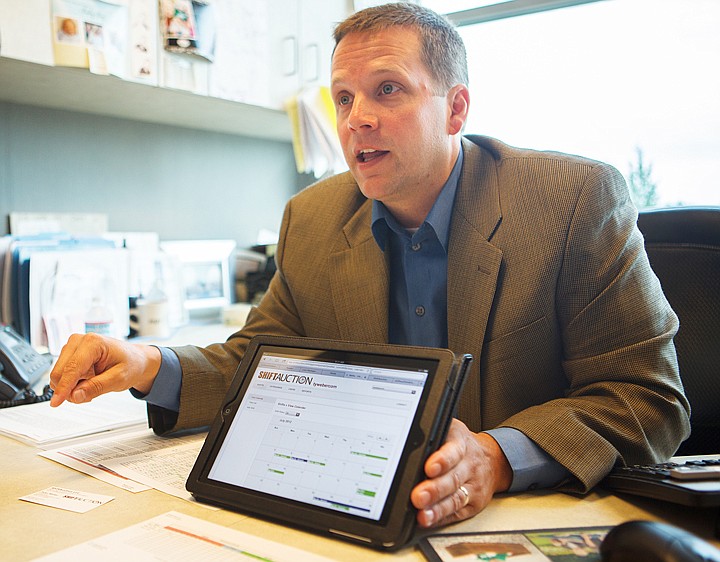 Patrick Cote/Daily Inter Lake Ty Webber talks about the benefits of Shift Auction, software he developed to help improve scheduling of employee's shifts. The web-based application can be used through most devices that have an internet connection. Tuesday, July 17, 2012 in Kalispell, Montana.