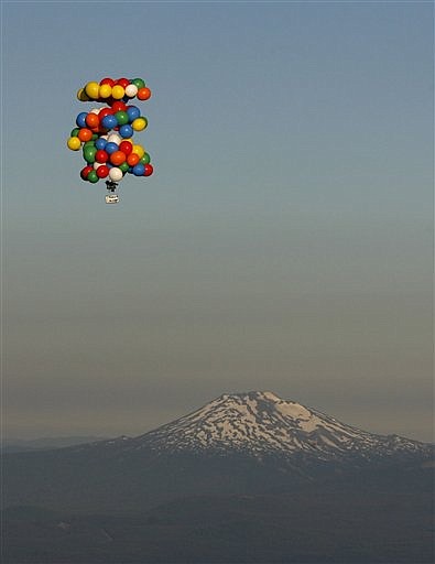 Two men flying matching lawn chairs suspended by helium-filled party balloons over Central Oregon last weekend said Tuesday they were floating along peacefully at 14,000 feet when thunderstorms grabbed control of their homemade craft like a giant hand.