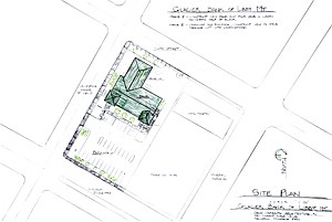 The site plan of the new bank building on California. Two existing properties will be demolished to make way.