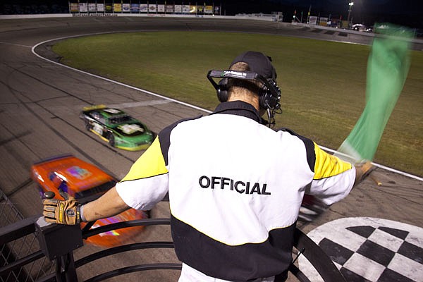 The green flag waves for the first race of the night July 20 at the Montana Raceway in Kalispell.