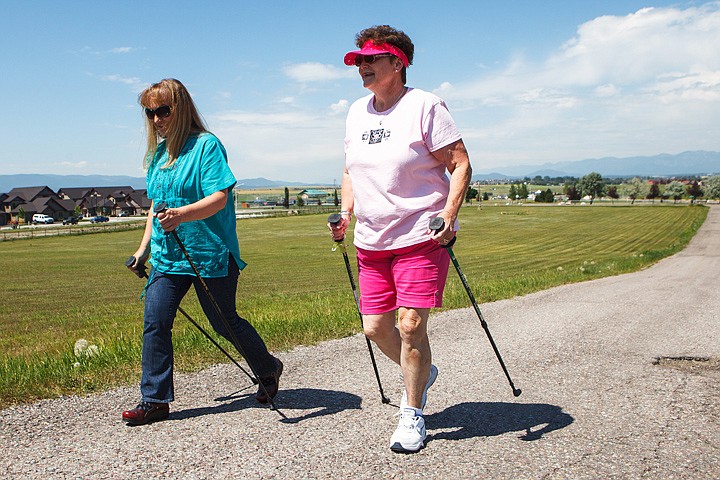 Patrick Cote/Daily Inter Lake Linda Smith, right, and Kathy Prim nordic walk near the Christian Center in Kalispell on Friday afternoon. "In the past I wouldn't have been able to climb this hill," said Smith. "The poles just take all the pressure off your back and knees." Friday, July 20, 2012 in Kalispell, Montana.
