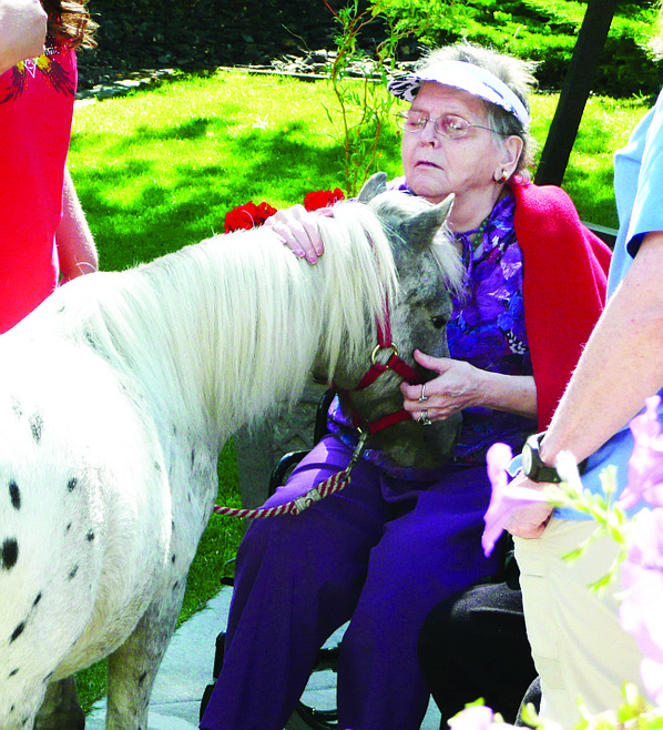 It was the Fourth of July 2011 when Cassandra and her husband Todd had their miniature horses in Bigfork’s parade and they noticed the residents of Lake View Care Center in the shade on a lawn quite a distance from the parade. They decided to take their little leopard appaloosas Kozmo and Domino up for a visit.