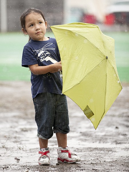 <p>Ladainian Kicking Woman, 4, waits as the rain delayed the start of the powwow on July 14 at the North American Indian Days Powwow in Browning on July 14.</p>