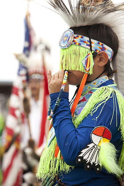 <p>Wyatt Madplume, 17, from Browning wears a traditional outfit during the parade at the North American Indian Days celebration on July 14.</p>