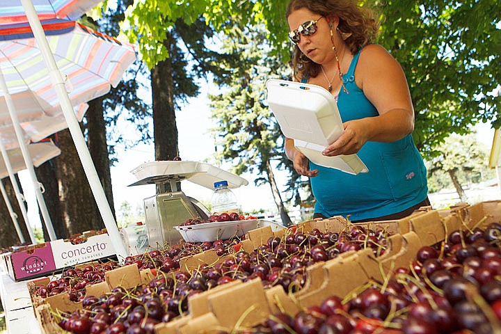 Patrick Cote/Daily Inter Lake Lou Coverdell weighs containers with cherries at the Foss Farms' cherry stand on Montana 35 south of Bigfork. Liu is on a road trip with his from Cedar Rapids, Iowa. Wednesday, July 25, 2012 in Bigfork, Montana.