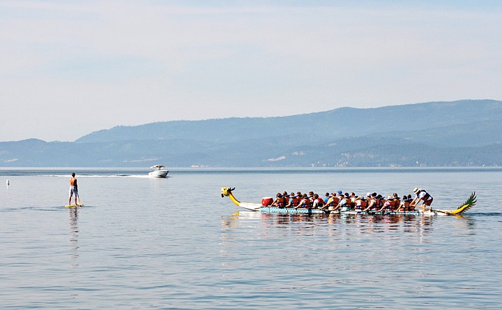 Twenty-two people sat in rows of two from head to tail, with one person manning the front and one at the back of the 46-foot long dragon boat that pushed off from Flathead Lake Lodge’s boat dock for a practice run on the lake Thursday morning.