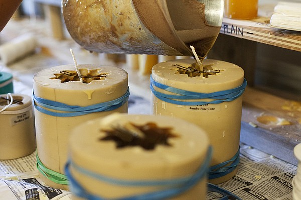 Courtney Fullerton pours wax into a candle mold in Babb on July 23. In addition to candles Glacier County Honey Company sells honey, beeswax, gift baskets and more on their website.