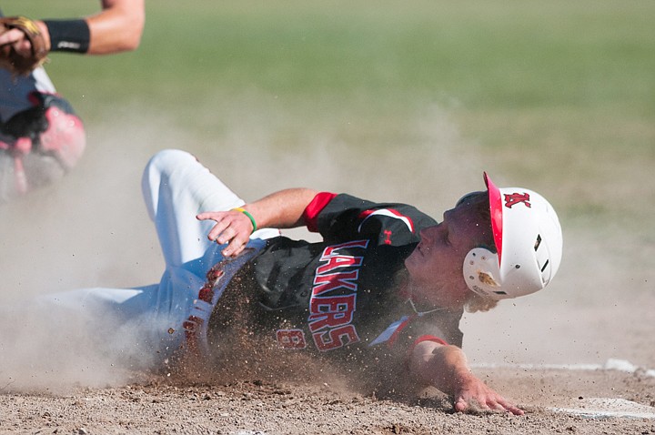 Patrick Cote/Daily Inter Lake Kalispell Lakers' Dillon Matteson slides safely into home plate to put the Lakers up by three in the first inning Wednesday evening during the first game of a Lakers Twins doubleheader at Griffin Field. Wednesday, July 25, 2012 in Kalispell, Montana.