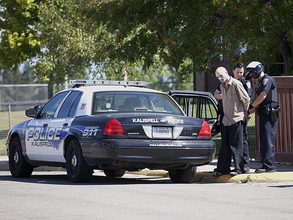Kalispell police officers arrest a suspect after receiving reports of an armed man on Wednesday in Kalispell. Sergeant Dave Overman says they found an AR-15 air-soft gun, the suspect was arrested for outstanding warrants.