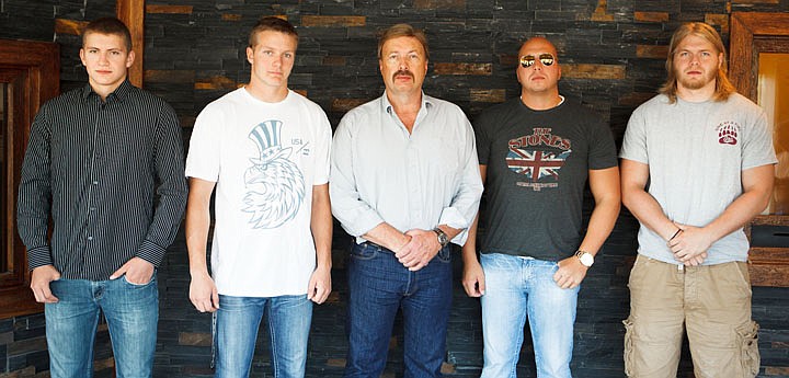The Harris family poses for a picture at Grizzly Security. (From left) Andrew, Caleb, Greg, Tiger and Josh. Caleb became the fourth member of the family to play in the East-West Shrine Game last month in Great Falls. Greg played in it in 1971, followed by sons Tiger in 2004 and Josh in 2008.
