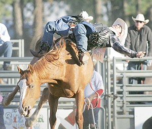 Richardo Oliveira of Bozeman aboard "Silk and Dynomite" in bareback riding Saturday.