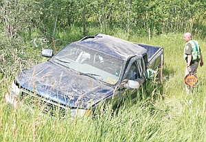 MHP Sgt. Duane Bowers inspects damage to a 2001 GMC pickup with Iowa plates Wednesday afternoon at the 45 mile marker on Hwy 2.
