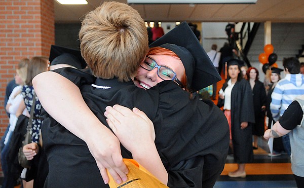 Heta Nikula, center, gets a hug from Jene Amundson as the seniors gather before the start of the commencement ceremony at Flathead High School Friday evening in Kalispell. Amundson was listed as recipient of the Jenner and Edith Orr Scholarship and the Pepsi Cola FHS Activities Scholarship. The pair were among 355 seniors who graduated from Flathead.
