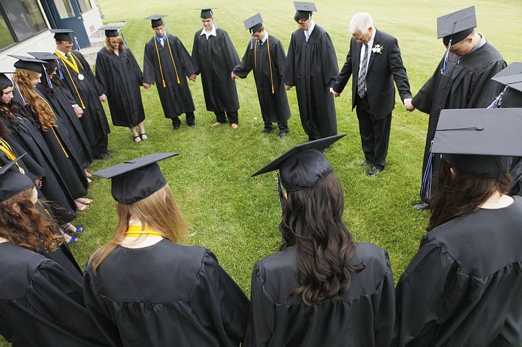 Stillwater Christian School seniors take a moment to pray before the start of graduation Friday night. Friday, June 1, 2012 in Kalispell, Montana.