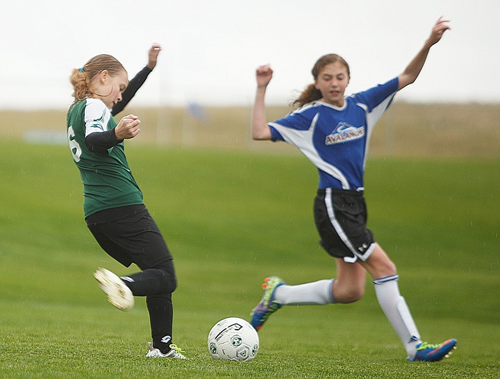 Patrick Cote/Daily Inter Lake Flathead Soccer Club's Cadie Williams (left) lines up to take a shot against a North Idaho Avalanche defender Saturday afternoon during the 3 Blind Refs tournament at Kidsports Complex. Saturday, June 2, 2012 in Kalispell, Montana.