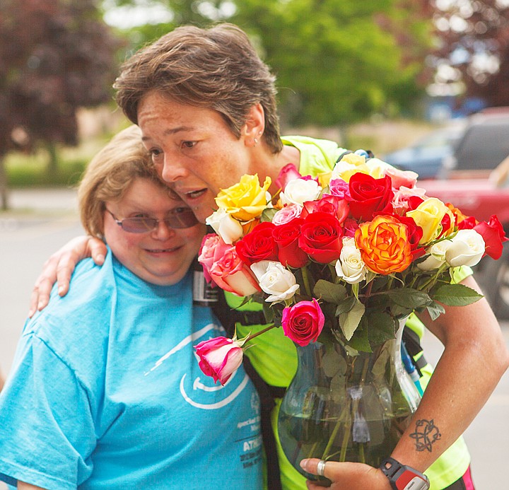 After finishing the final leg of her 91-mile fundraising run, Kelda Latham-Bennett, right, is greeted by Special Olympics athlete Chrissy Siefke in the Flathead Industries parking lot Monday afternoon. Latham-Bennett raised more than $4,000 for Special Olympics of Montana by running from Libby to Kalispell. The two-day run started Sunday at Achievements' Parkside Thrift Store in Libby and concluded Monday afternoon at Flathead Industries in Kalispell. Monday, June 4, 2012 in Kalispell, Montana.