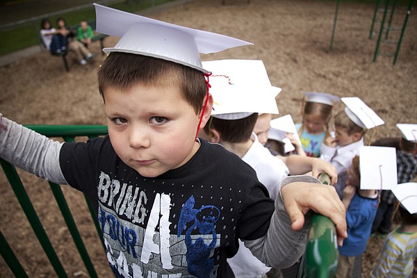 Kindergartner Dylan Hefner waits his turn to slide down the slide at the end of the Cornelius Hedges School graduation on Wednesday, June 5. Before going down the slide, students were asked what they wanted to be when they grow up. Hefner wants to be a firefighter.