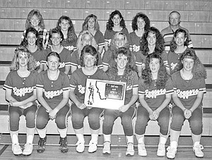 Seniors Christy Konzen and Tracee Hanson and their teammates hold up the first place trophy at the state Class B tournament in Lewistown. Greg Van Tighem photo from the Dec. 9, 1992, files of The Western News.